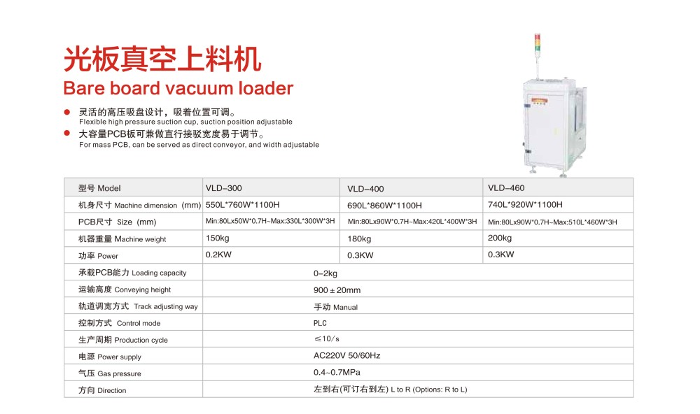 PCB尺寸(mm) | Min:80Lx50W*0.7H~Max:330L*300W*3H | Min:80Lx90W*0.7H~Max:420L*400W*3H | Min:80Lx90W*0.7H~Max:510L*460W*3H |
