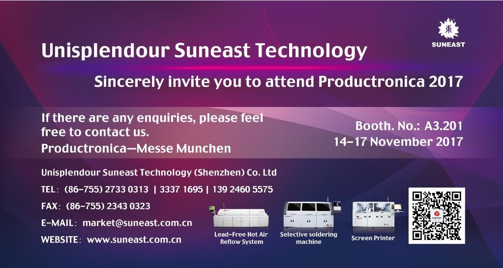 2017年11月14日至17日,Productronica2017將在德國慕尼黑新國際博覽中心舉行。屆時,日東科技將攜帶選擇性波峰焊SUNFLOW3、回流焊SER706A、全自動錫膏印刷機SL120亮相Productronica2017展會,歡迎大家蒞臨A3.201展臺參觀。